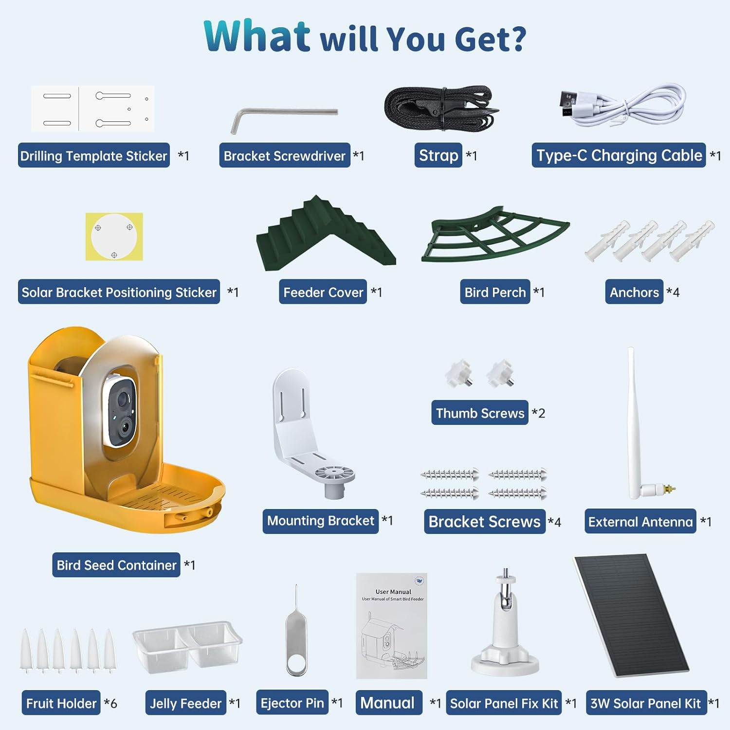 Figure 1: Included Components. The package contains the bird feeder unit, solar panel, mounting hardware, charging cable, and various accessories for bird feeding.
