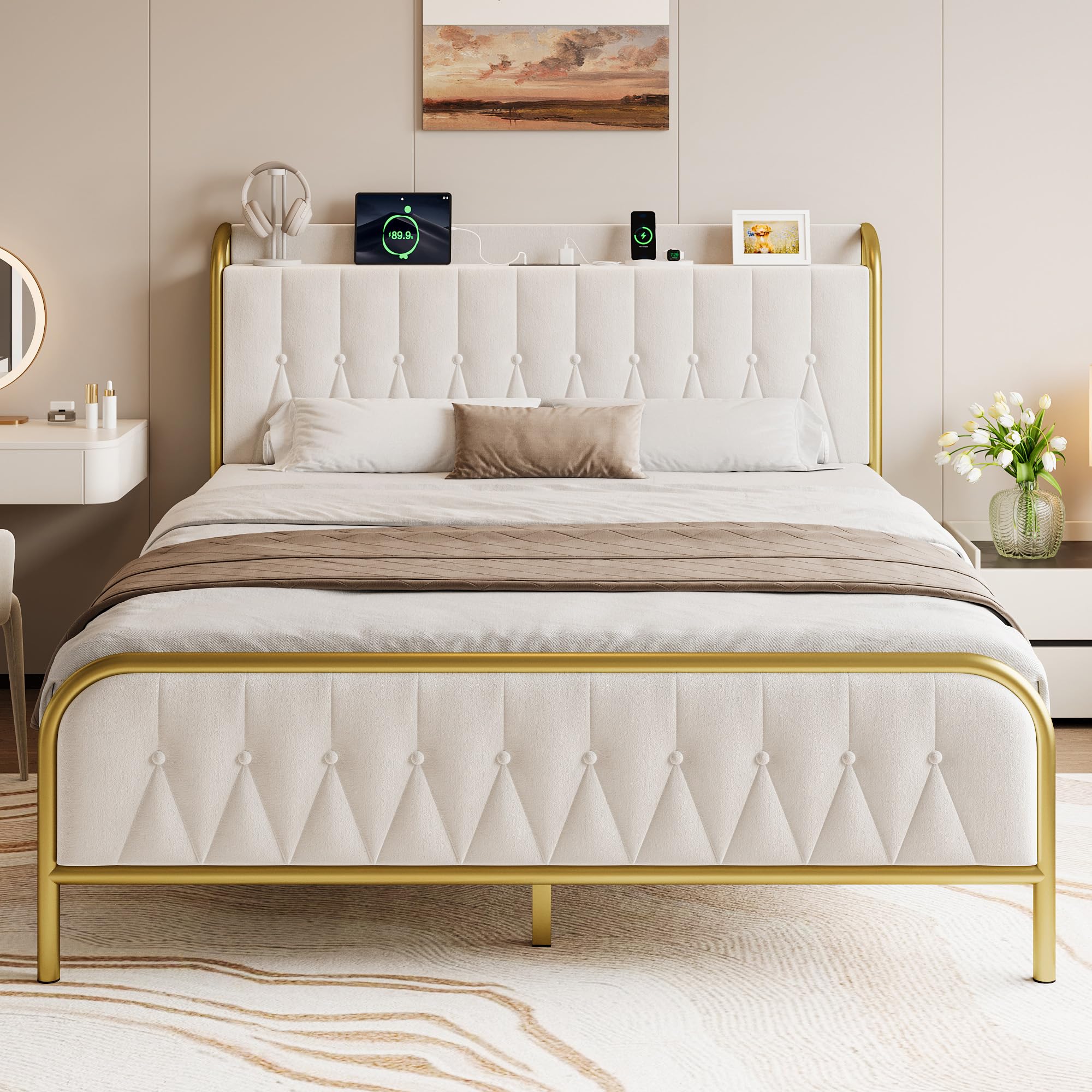 Image: Einhomn Full Size Velvet Bed Frame with Charging Station (Beige).