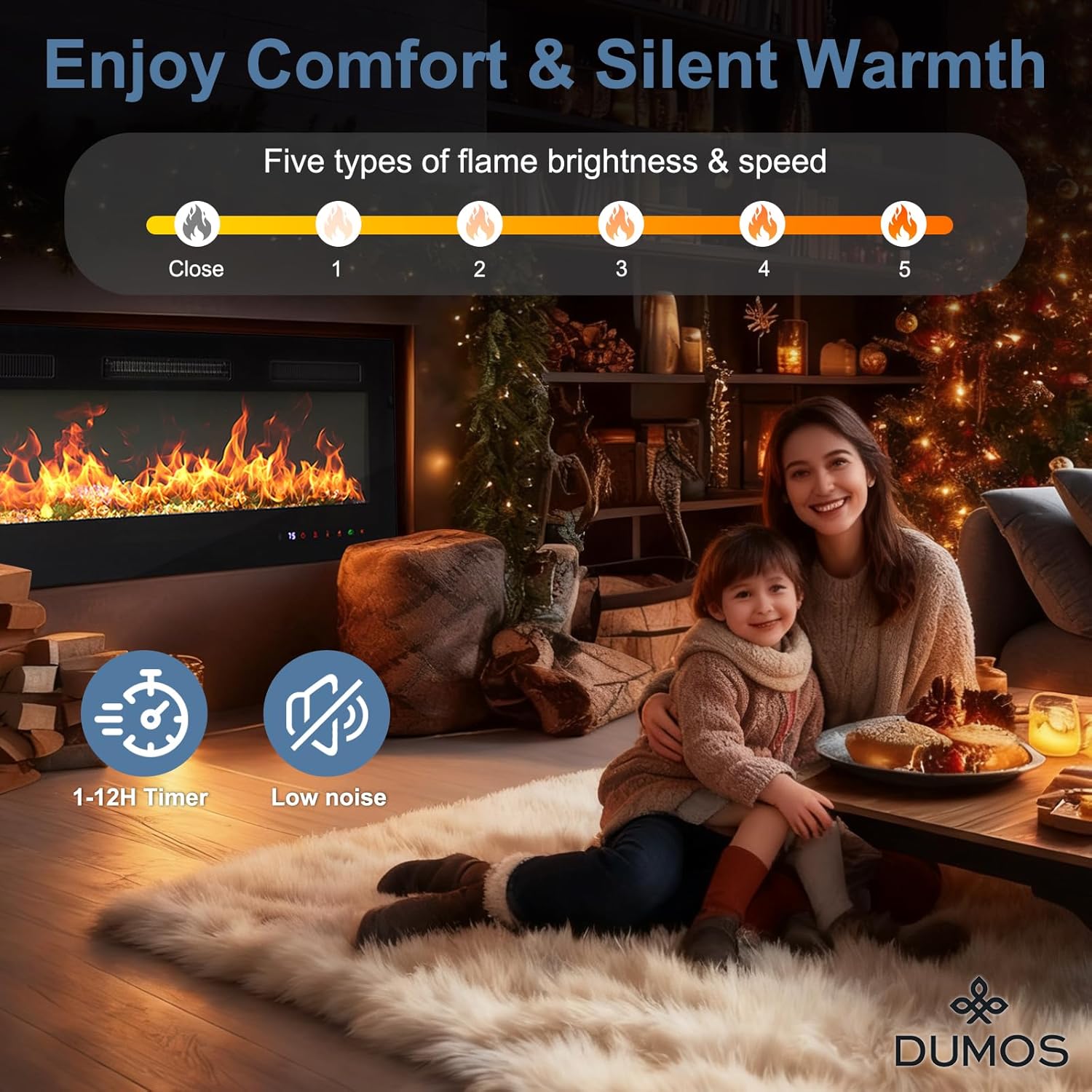 The DUMOS 42-Inch Electric Fireplace Heater offers versatile heating and ambiance for your home. It features multiple installation options, adjustable flame and ember bed colors, and convenient control methods.