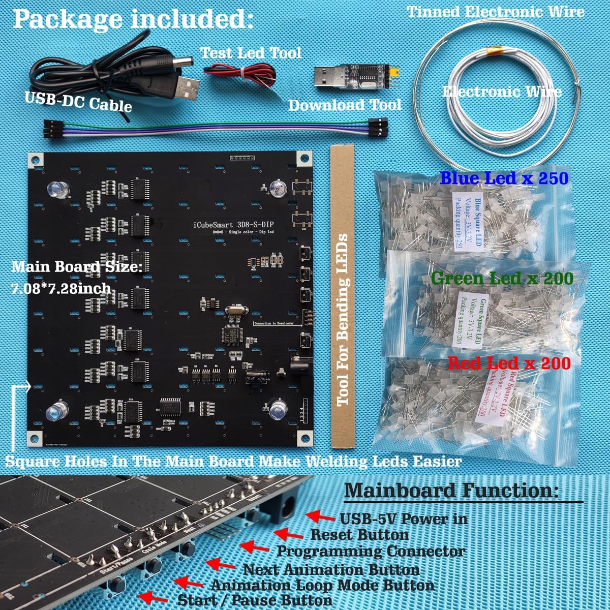 This manual provides comprehensive instructions for assembling and operating your iCubeSmart 3D8S-MULTI-DIY-KIT LED Cube Kit. This kit is designed as a DIY electronics project, suitable for learning soldering and understanding 3D LED display technology. The mainboard comes pre-installed with the program, and the package includes paper installation instructions to guide you through the process.