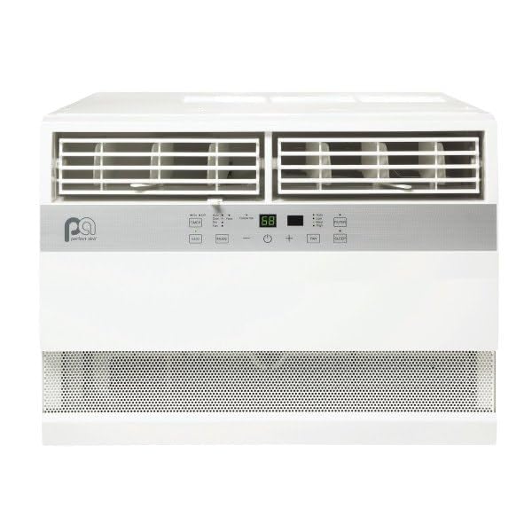 The Perfect Aire 4PACH12000 is a versatile window-mounted air conditioning unit featuring a self-touch electronic control pad and a full-function remote control. It includes multiple operating modes such as Cool, Heat, Fan, Auto, Sleep, Dry, and Energy Saver. The unit is equipped with a front-mounted, tilt-out air filter for easy maintenance.