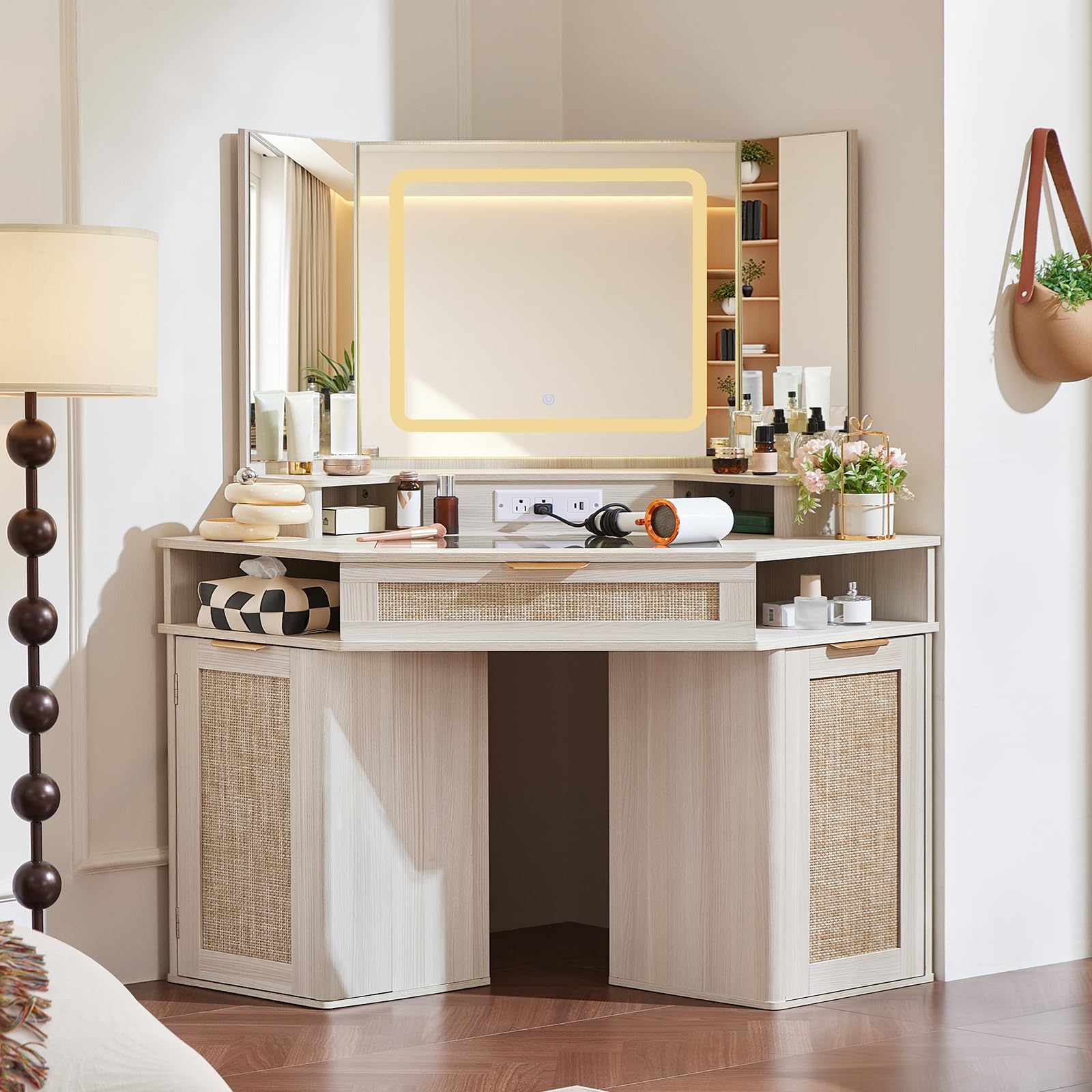 The Lerliuo makeup vanity desk integrates rattan craftsmanship with modern design, creating a naturally warm aesthetic. This corner vanity desk includes a charging station, curved lines, and metal handles. The 3-way mirror and adjustable lighting illuminate the high-definition tempered glass surface, enhancing the visibility of items stored in the drawers.
