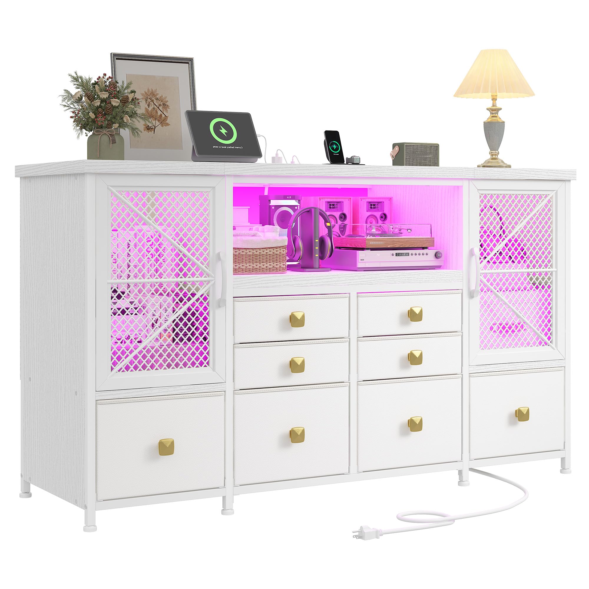 The EnHomee Dresser (Model: B0FWJP31X8) is a versatile storage solution featuring 8 fabric drawers, 2 mesh-door cabinets, and an open shelf. It includes integrated RGB LED lighting and a built-in charging station with AC outlets and USB ports. This unit can also function as a TV stand for up to a 60-inch television.