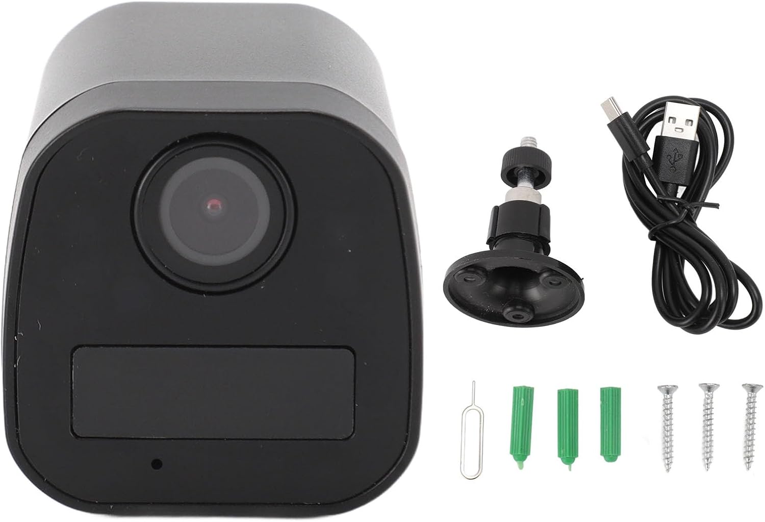 Image: Contents of the Dpofirs 1080P Night Vision Security Camera package, including the camera, mounting stand, USB data cable, and installation hardware.