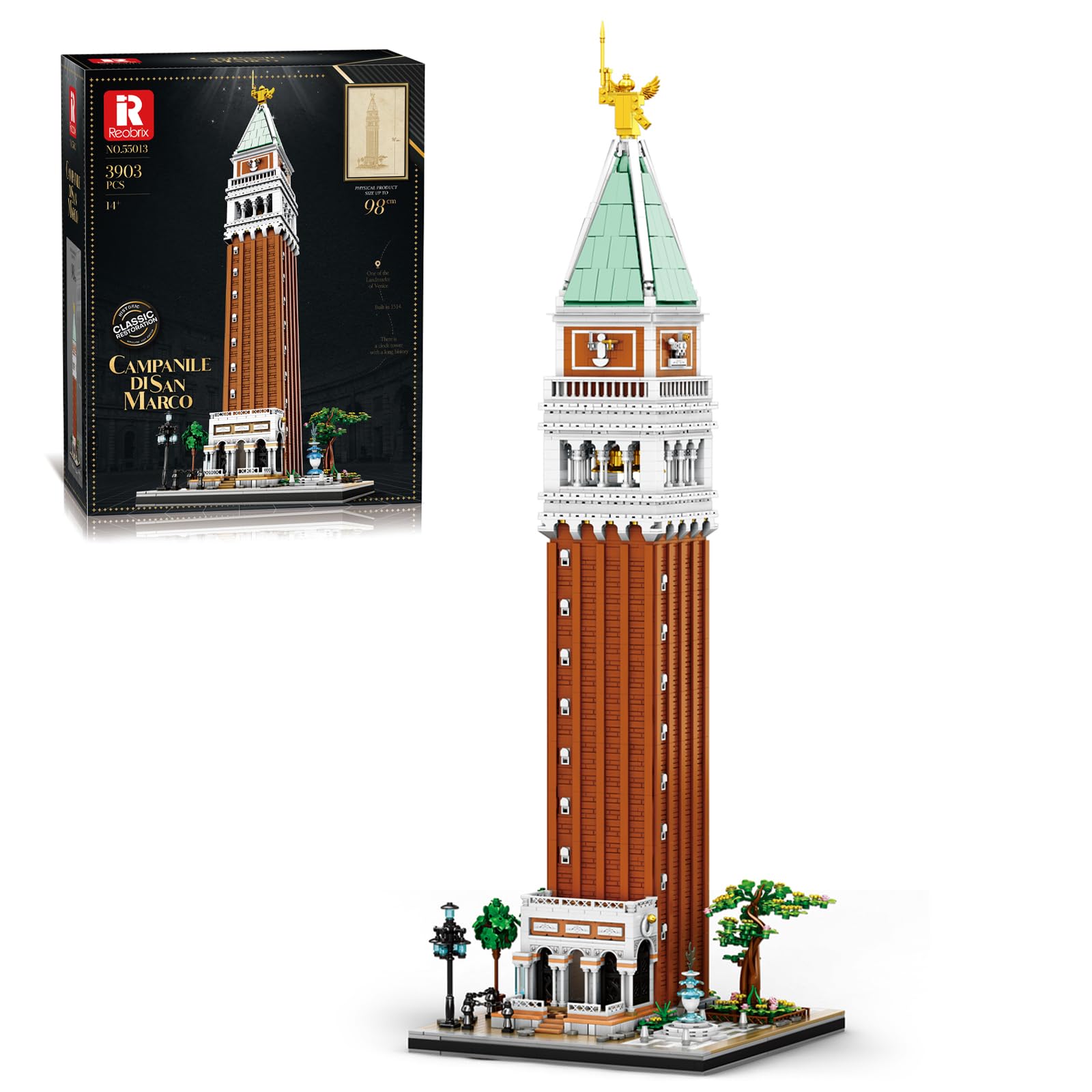 This manual provides instructions for assembling the Reobrix St. Mark's Campanile Building Block Set, model 55013. This set allows for the construction of a detailed 1:100 scale replica of the iconic St. Mark's Bell Tower in Venice, Italy. The completed model stands approximately 98 cm (38 inches) tall and consists of 3903 pieces. Please read all instructions carefully before beginning assembly.
