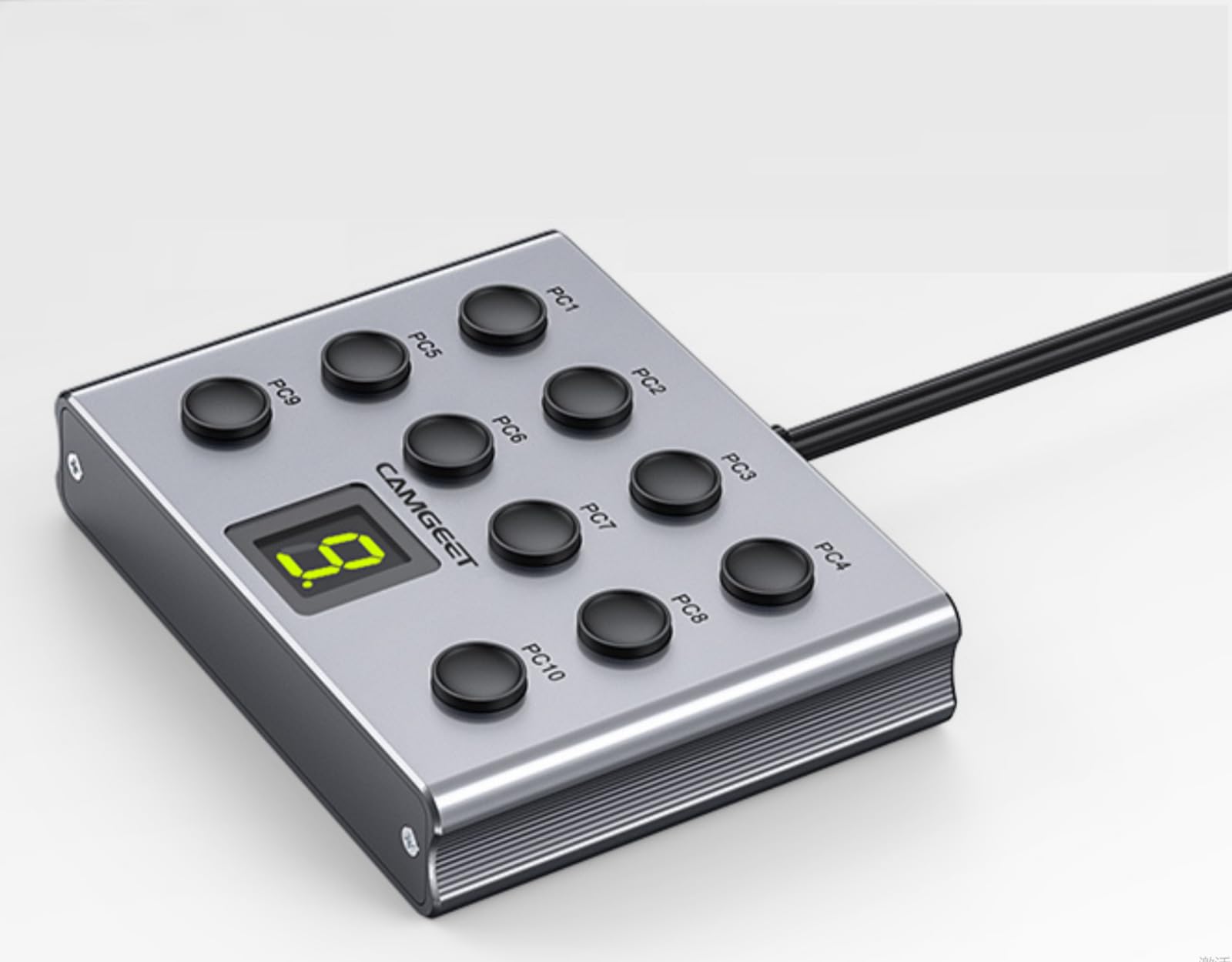 The camgeet Wired Remote Extension Button is a compact desktop controller that connects to your compatible camgeet KVM switch. It features individual buttons for each port (PC1-PC10) and a digital display to indicate the currently active computer. This remote simplifies the process of switching between multiple systems without needing to access the KVM switch directly.