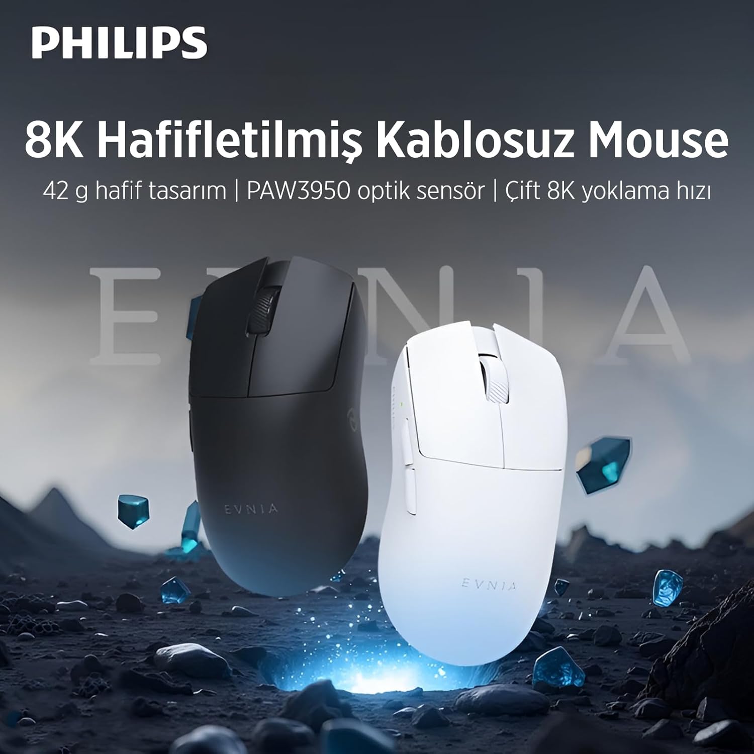Image: Philips EVNIA SPK9718 Wireless Gaming Mouse, showcasing both black and white color variants. This mouse features an 8K polling rate and a lightweight design.