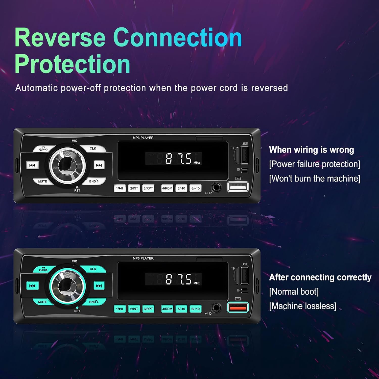Image: Reverse Connection Protection. This image illustrates the car stereo's power failure protection feature. If the power cord is wired incorrectly, the unit will automatically power off to prevent damage. When wired correctly, the unit boots normally without issue.