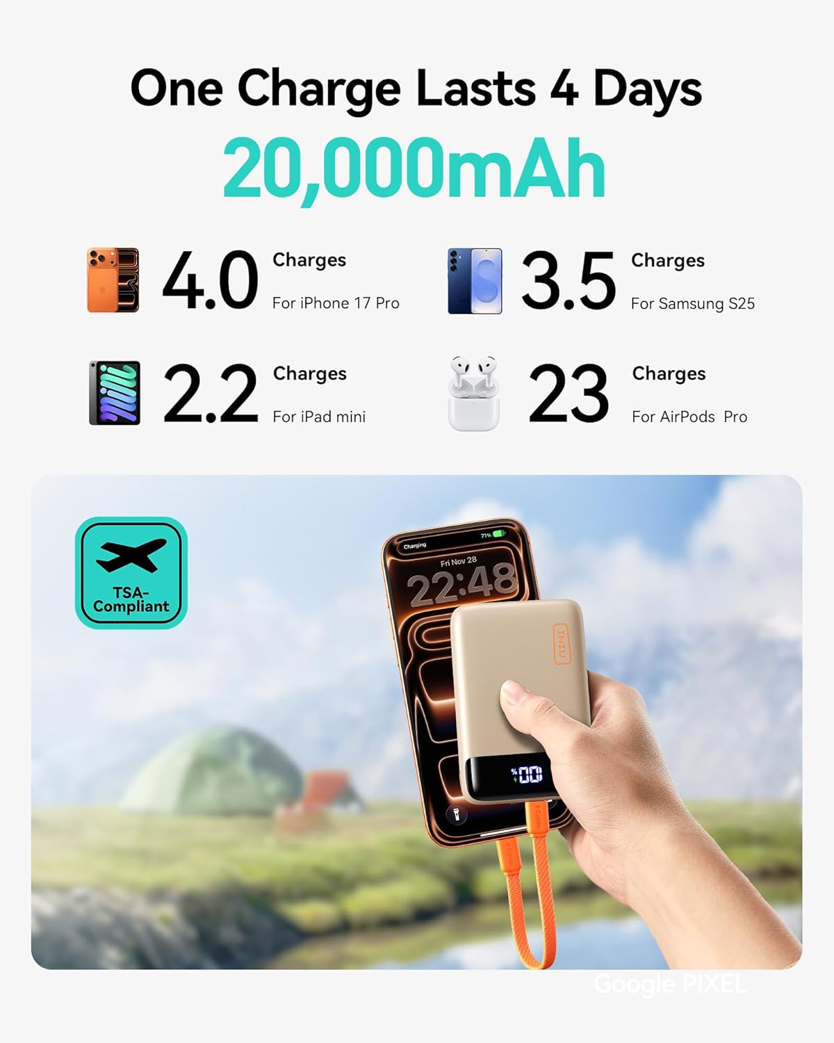 The INIU Portable Charger provides extended power, capable of charging an iPhone 17 Pro up to 4 times, a Samsung S25 3.5 times, an iPad mini 2.2 times, and AirPods Pro 23 times on a single charge. It is also TSA-compliant for air travel.