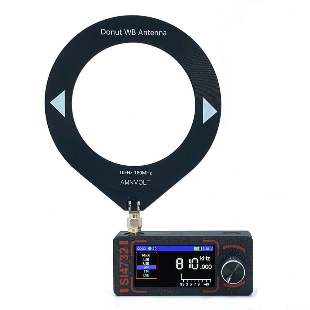 Image 1.1: The SI4732 Portable Shortwave Receiver with an attached loop antenna, held in hand. The screen displays frequency and mode information.