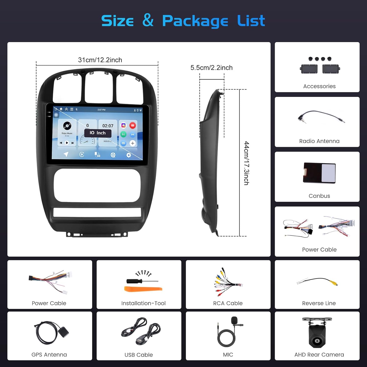 A night vision waterproof AHD backup camera is included. The reversing input must be plugged in even if the camera is not used, otherwise, WiFi and Bluetooth signals may be affected.