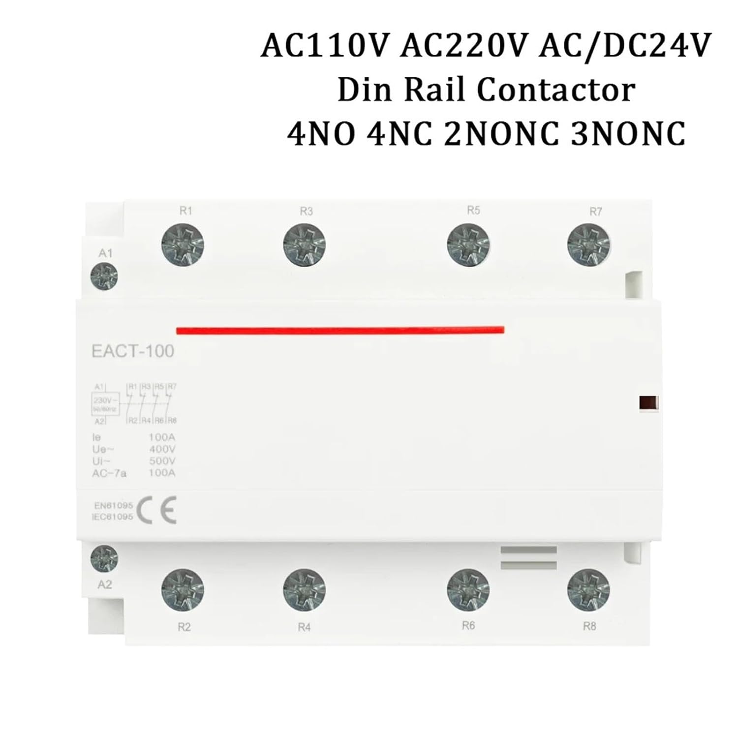 The EACT-4P-100 AC Contactor operates by energizing its coil (A1-A2 terminals). When the coil is energized with the specified control voltage (e.g., 24V DC, 110V AC, 220V AC), the magnetic field generated pulls the armature, causing the main contacts to change state. Normally Open (NO) contacts will close, and Normally Closed (NC) contacts will open, thereby controlling the connected electrical load.