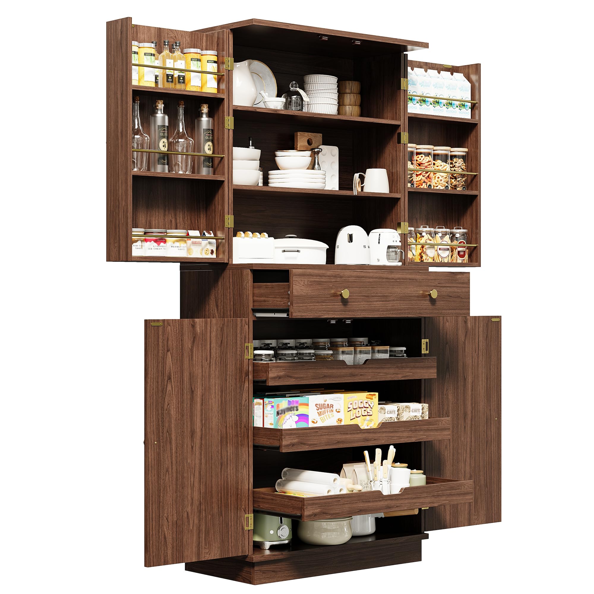 This image displays the IRONCK Farmhouse Kitchen Pantry Cabinet with all doors open, revealing its extensive storage capabilities. The upper section features multiple shelves and door racks filled with spices, bottles, and dishes. The middle section includes a drawer and open shelves. The lower section shows pull-out shelves with various pantry items. The cabinet is made of walnut brown engineered wood.