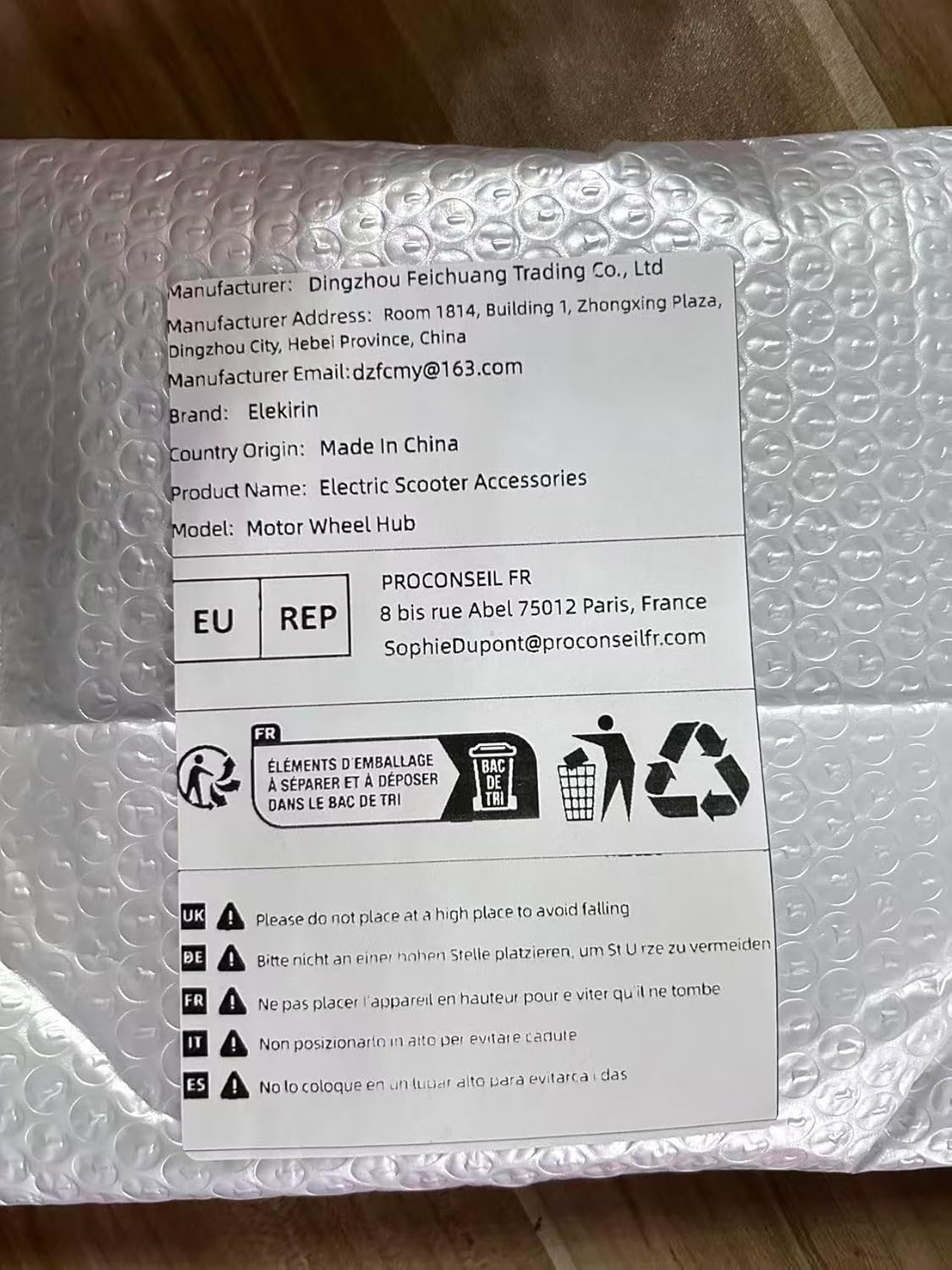 Figure 3.1: The Elekirin Motor Wheel Hub Ring as received in its protective packaging. The label shows manufacturer details and product information.