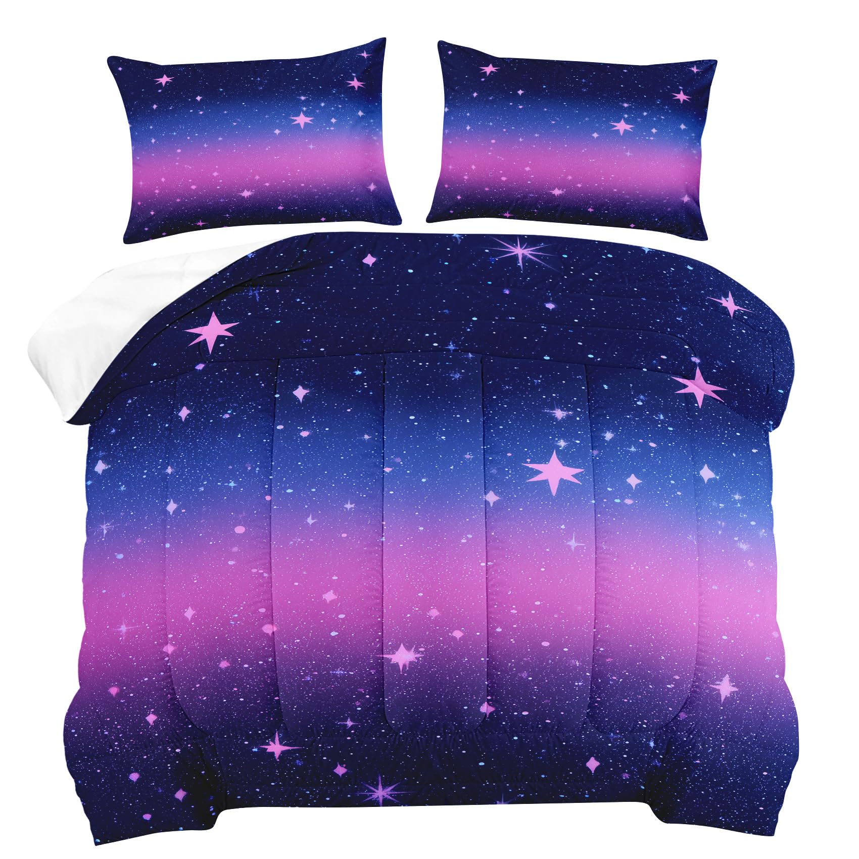 Image 1.1: The Generic Purple Galaxy Comforter Set, King Size, featuring a vibrant starry sky pattern in blue and purple hues, laid out on a bed with two matching pillow shams.