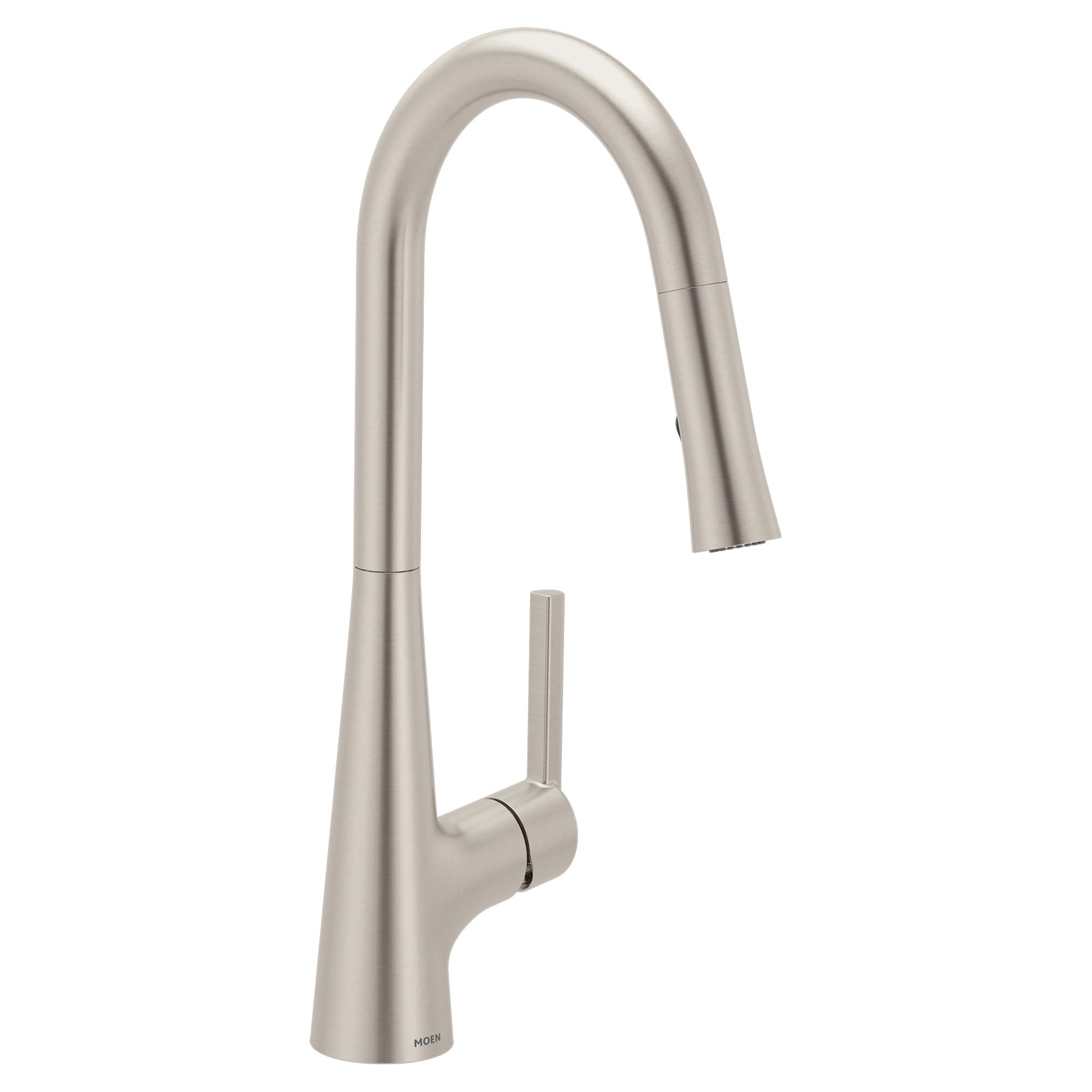 Image: Moen Ronan Pulldown Kitchen Faucet in Spot Resist Stainless finish, showcasing its high-arc design and integrated handle.