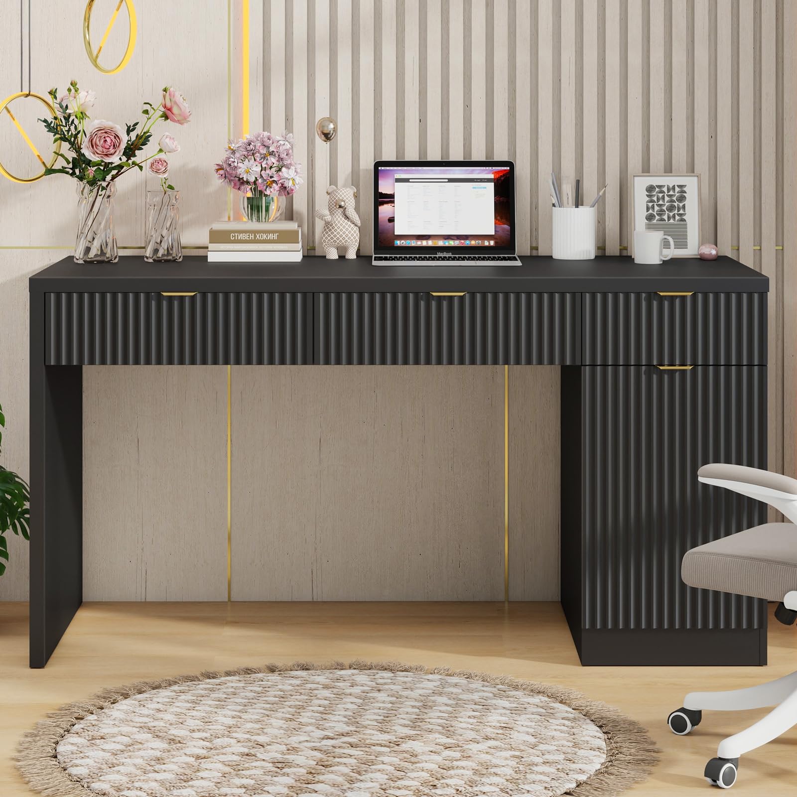The desk includes three fluted drawers: one wide and two medium. These drawers are equipped with smooth-gliding slides for easy access to your stored items.