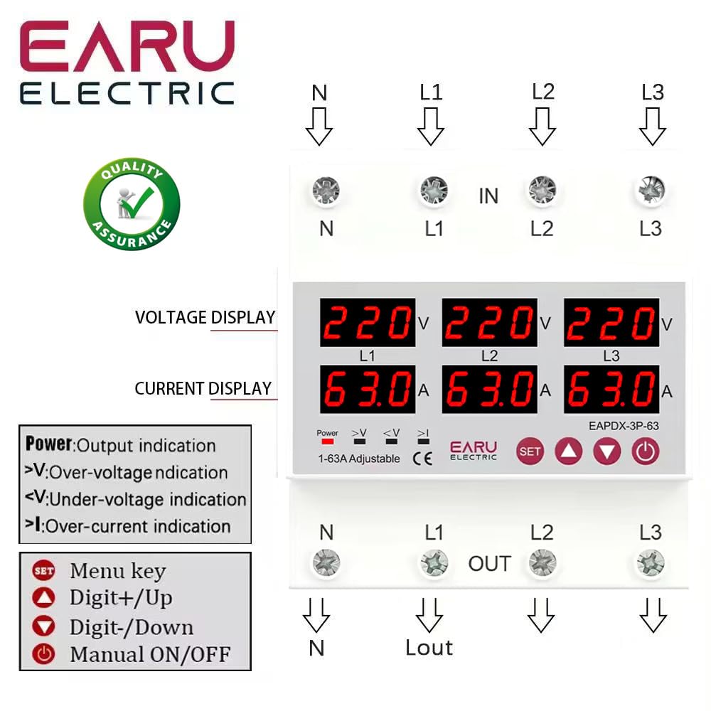 This manual provides comprehensive instructions for the installation, operation, and maintenance of the EARU Electric 3-Phase Voltage and Overcurrent Protector, Model EARU-1008. This device is designed to safeguard 3-phase electrical systems by continuously monitoring voltage and current, offering protection against over-voltage, baix voltage, overcurrent, and phase failure. It is suitable for industrial and commercial applications requiring reliable electrical monitoring and protection.