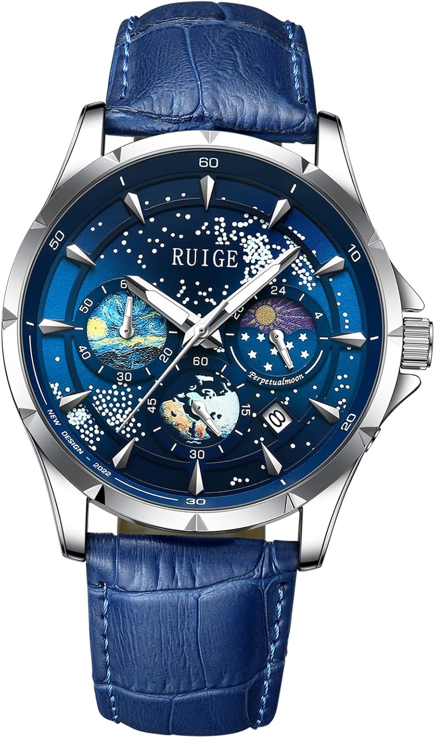 The RUIGE N3 watch features precise quartz movement, a calendar display, a moon phase indicator, and a 24-hour sub-dial, all designed for reliable timekeeping and functionality.
