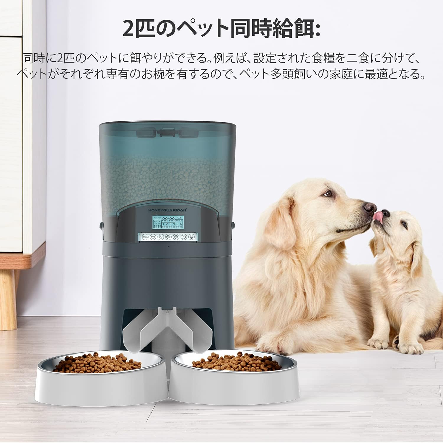 Thank you for choosing the HoneyGuaridan Automatic Pet Feeder. This device is designed to provide scheduled and portion-controlled meals for your pets, ensuring they maintain healthy eating habits. It features a versatile design that can accommodate one or two pets, a large 7-liter food capacity, and a reliable dual power supply system.