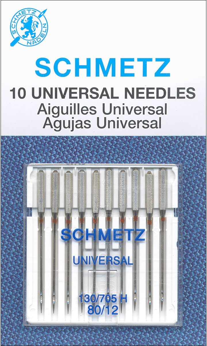 The SCHMETZ Universal Machine Needles package contains ten (10) needles of size 80/12. This size is suitable for general sewing tasks on light to medium weight fabrics. The needles feature a slightly rounded point, allowing them to penetrate woven fabrics without damaging threads and to push aside knit fibers without breaking them.