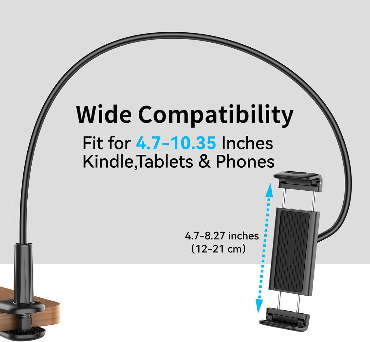 The stand is suitable for all devices with screen sizes between 4.7 and 10.5 inches, including Kindles, tablets, and phones.
