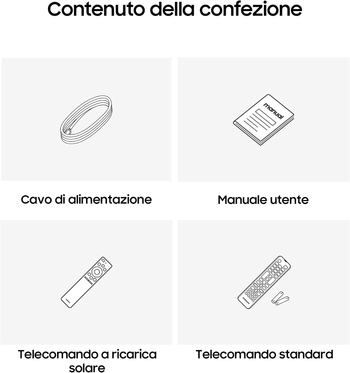 Imagen: Contenido del paquete. This image illustrates the items included in the box: the Samsung Smart TV, a power cable, a user manual, a solar-powered remote control, and a standard remote control.