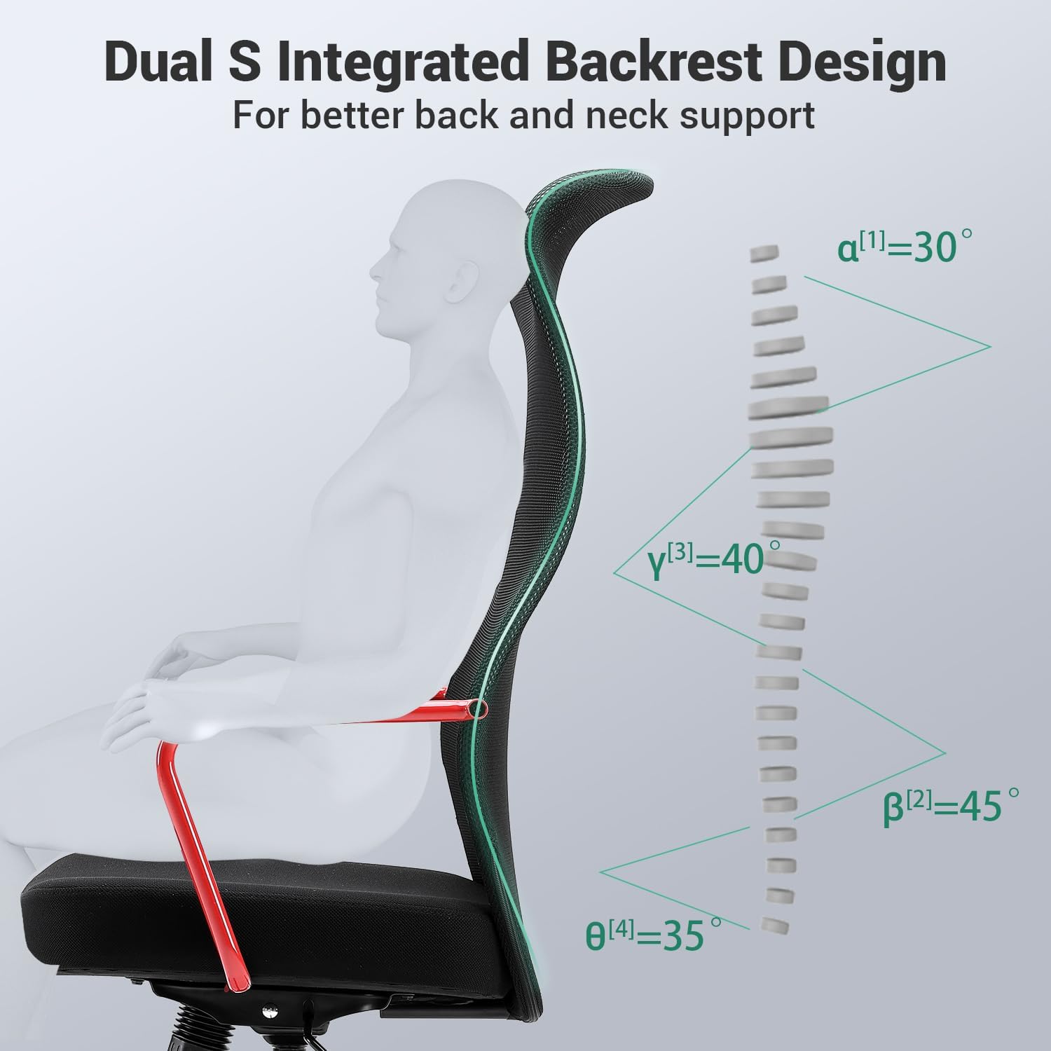Image: Diagram highlighting the ergonomic design of the dual S-shaped backrest for neck, spine, and lumbar support.