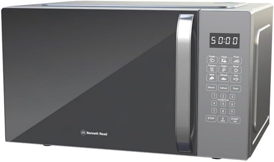 Hoto 1: Gaba view of the Bennett Read KMW102 Digital Microwave. This silver microwave features a dark mirror-finish door, a robust handle, and a digital control panel on the right side.