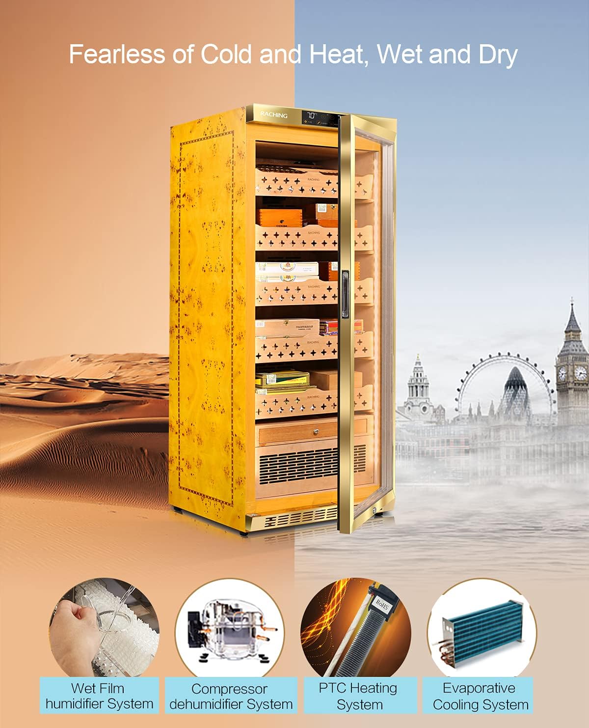 The RACHING MON1800 Cigar Humidor Cabinet is designed to provide an optimal environment for storing and aging cigars. This climate-controlled cabinet features advanced humidity, temperature, and ammonia removal systems to ensure your cigars maintain their best status, preventing issues like dampness, cracking, and loss of fragrance. This manual provides essential information for the proper setup, operation, and maintenance of your humidor.