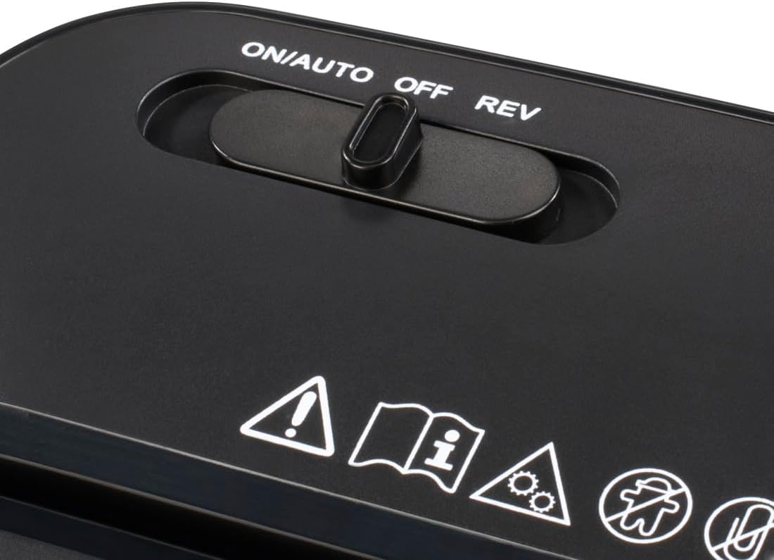 Fordított funkció: In case of a paper jam, slide the switch to the "REV" (Reverse) position. This will reverse the shredding mechanism, helping to clear the jam. Once the jam is cleared, return the switch to "ON/AUTO" or "OFF".