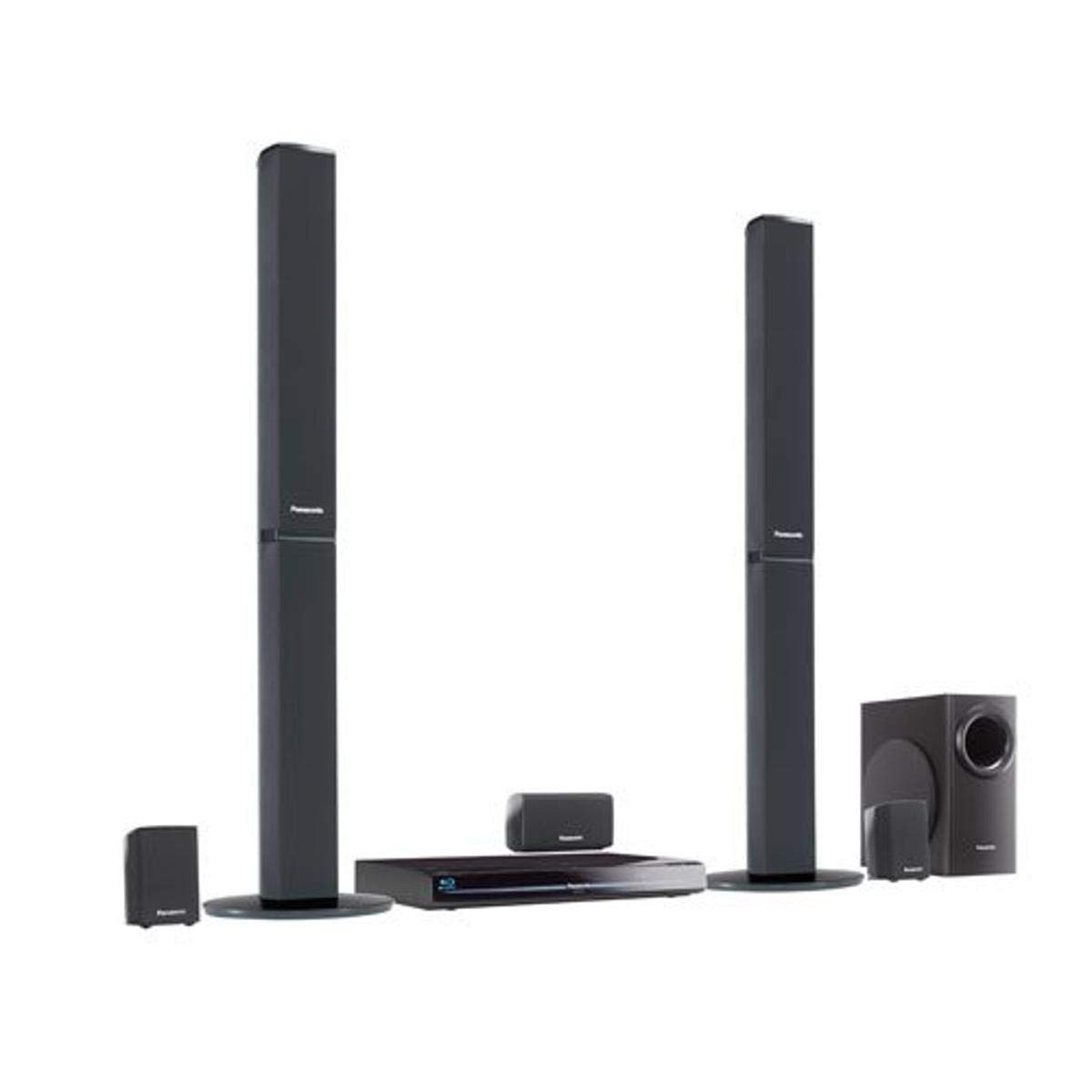 Figura 1: Panasonic SC-BT330 Home Theater System. This image displays the main unit (Blu-ray player/amplifier) and the accompanying speakers, including the tallboy front speakers and the subwoofer, providing a visual overview del sistema completo.