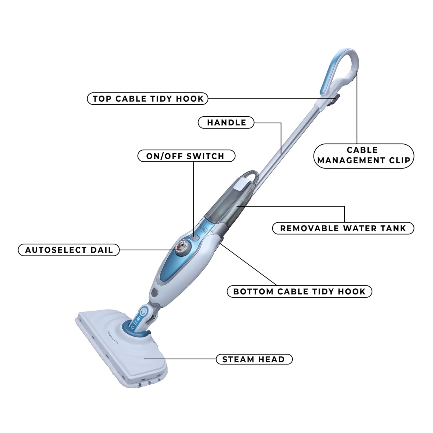 This image displays the BLACK+DECKER FSM1620 Steam Mop with various parts labeled for identification. Key components include the handle, top cable tidy hook, cable management clip, ON/OFF switch, removable water tank, AutoSelect dial, bottom cable tidy hook, and steam head.
