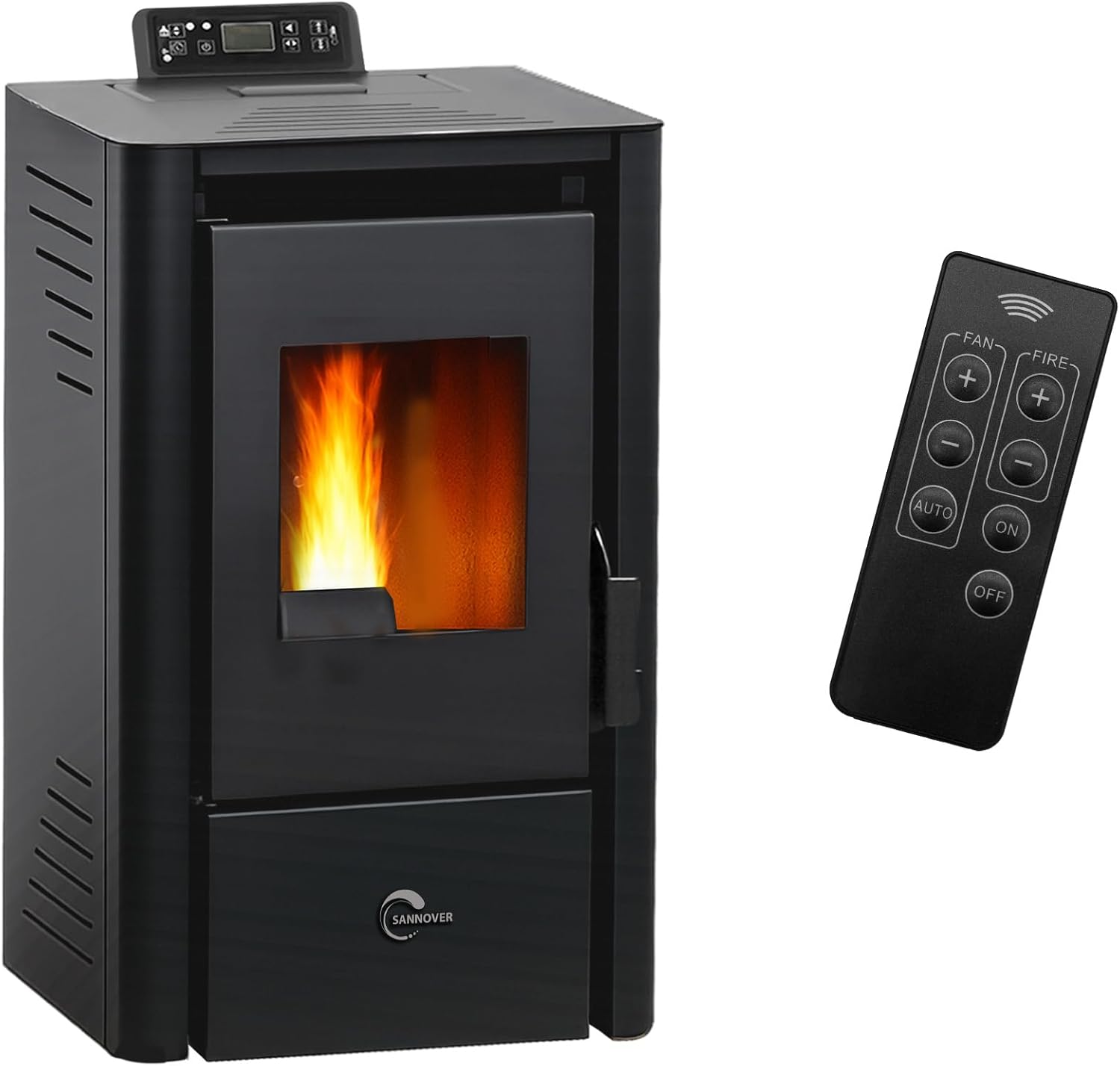 Image 1: Sannover Anita 9.4 kW Sealed Pellet Stove and its remote control. The stove is black with a glass door showing flames, and a control panel on top. The remote control has buttons for fan, fire, auto, on, and off.