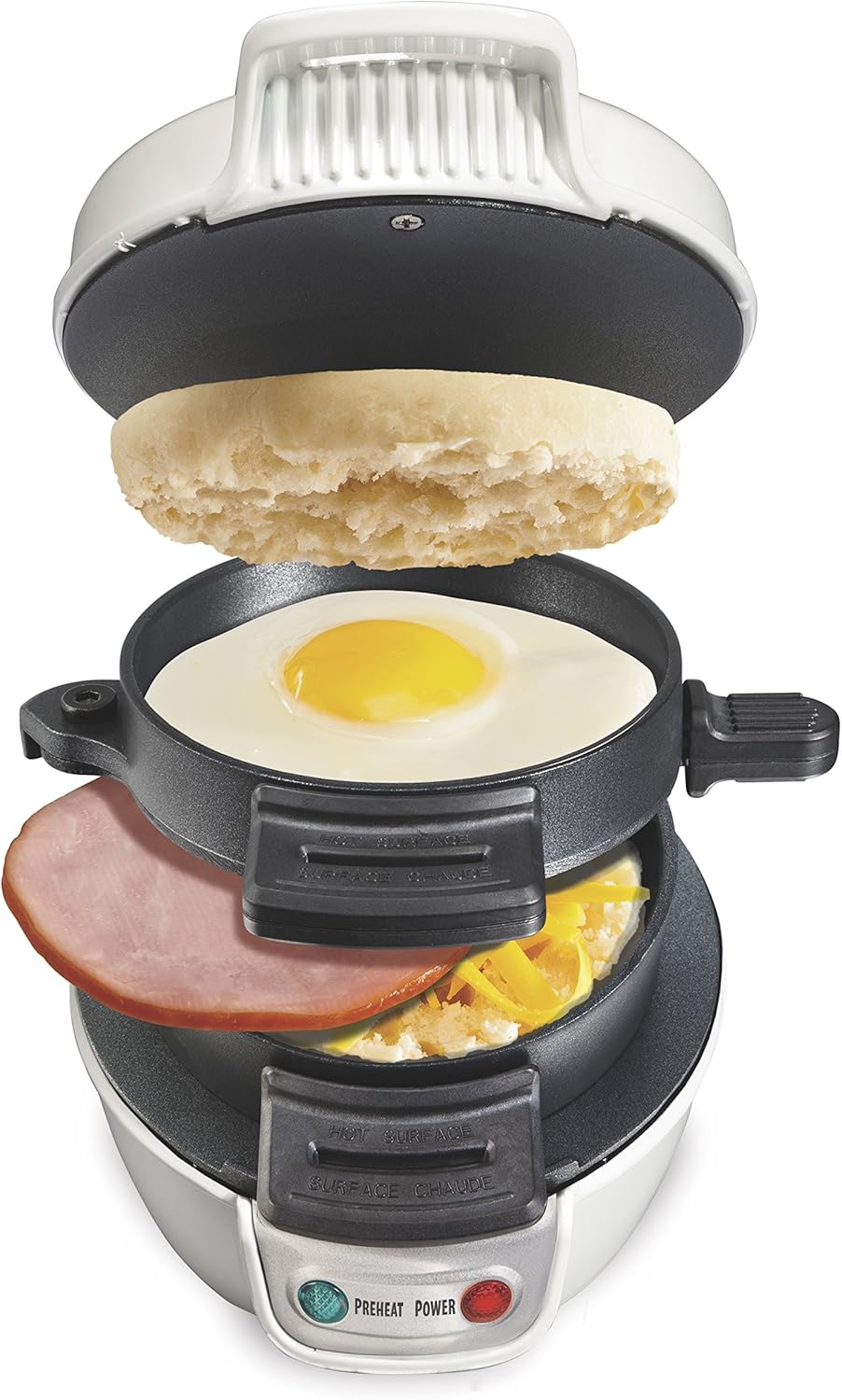 התפוצץ view of the sandwich maker illustrating the various layers of a breakfast sandwich: English muffin, egg, ham, and cheese.