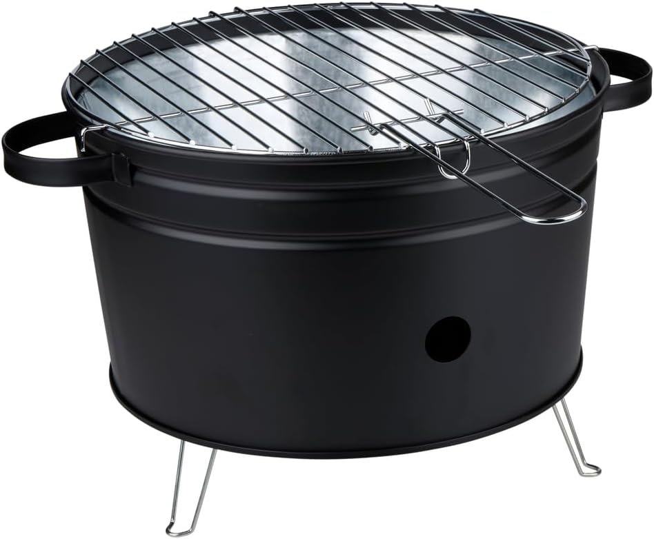 איור 1: גריל פחמים שולחני Alpina מורכב במלואו. תמונה זו מציגה את גוף הגריל השחור והקומפקטי, רשת הגריל מפלדת אל-חלד והידיות המשולבות בצדדים. רגלי התיל החזקות נראות בבסיס, ופתח אוורור קטן נמצא בצד גוף הגריל.