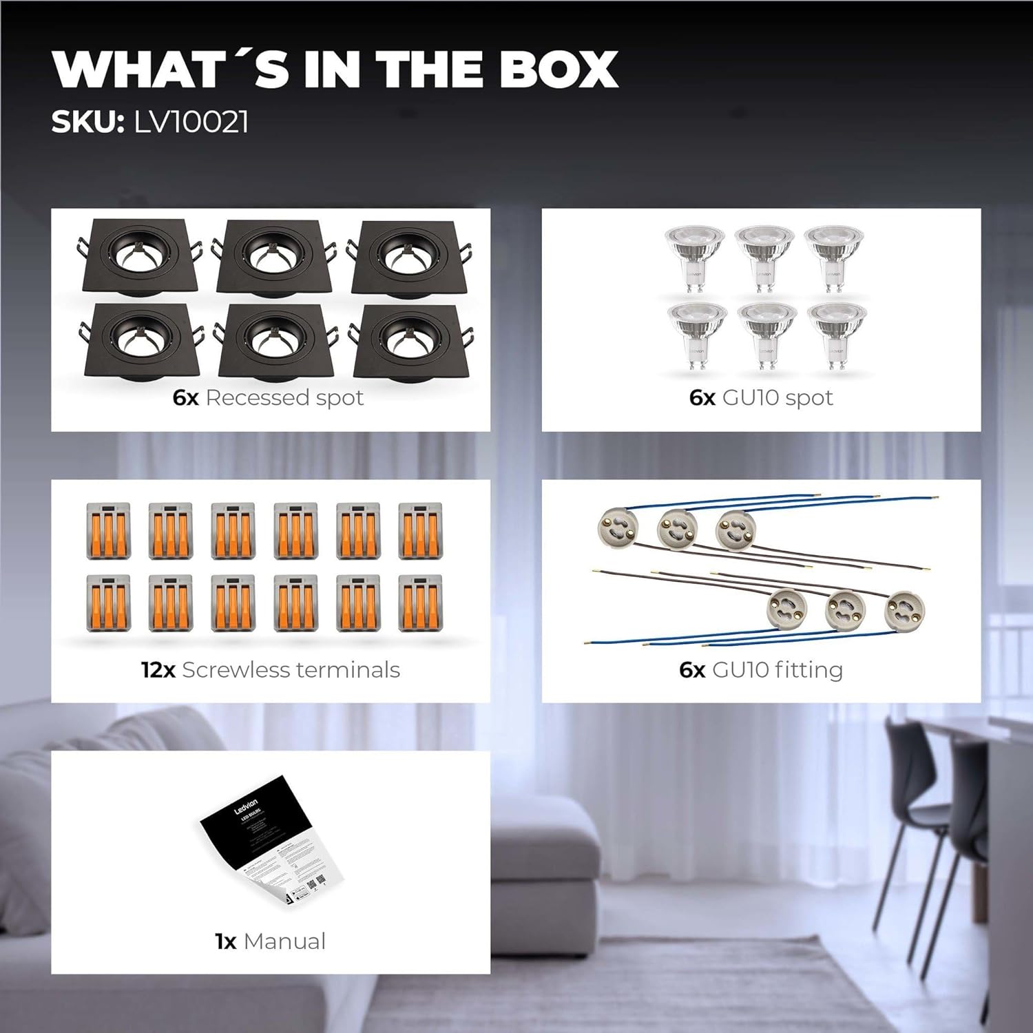 Image: The package contents include recessed spots, GU10 bulbs, screwless terminals, GU10 fittings, and a manual.