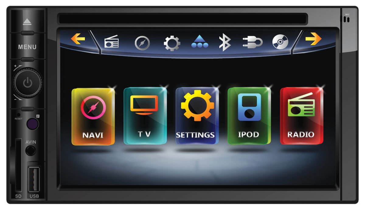 - 메뉴 탐색: 터치스크린 또는 물리적 메뉴 버튼을 사용하여 메인 메뉴에 접근하고 옵션을 탐색하세요. 메인 화면에는 내비게이션, TV, 설정, iPod, 라디오 아이콘이 표시됩니다.