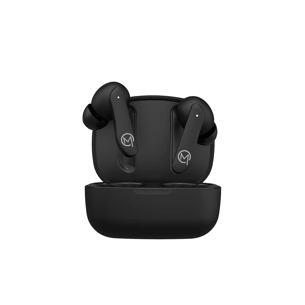 Figure 1: MOBILLA MBUDS 101 Matte Black Earbuds in their charging case.