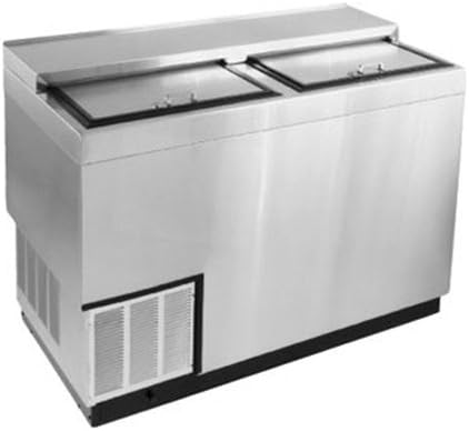 Image: The Glastender ST48-B Bottle Cooler, showcasing its stainless steel exterior, two top-access sliding lids, and the ventilation grille on the lower left side for the refrigeration system.