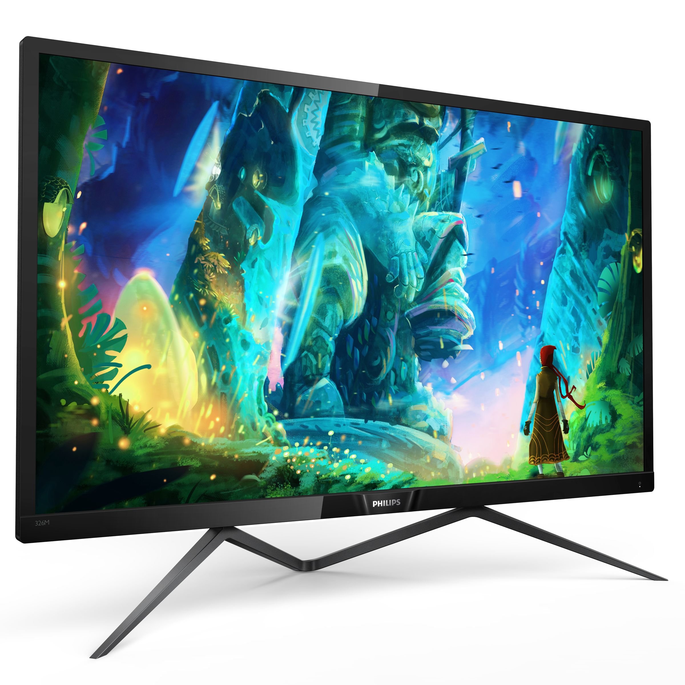 This image displays the Philips Momentum 326M6FJSB monitor from an angled perspective, showcasing its slim bezels and the distinctive stand design. The screen displays a vibrant, futuristic scene.