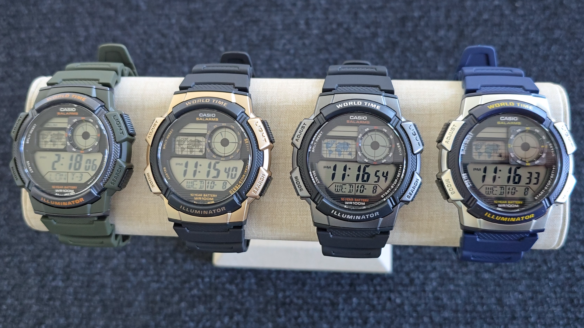 Image: Casio AE1000W Digital Watch series in various color options.