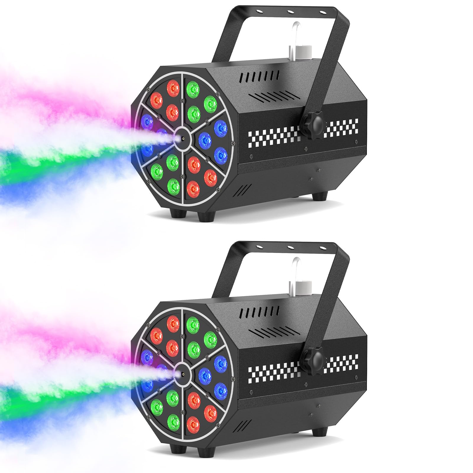The included wireless remote controller allows for easy adjustment of fog output and color settings from a distance. The machine features 18 vibrant LED lights with multiple effect modes.