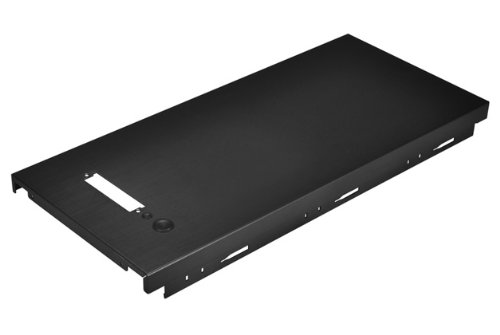 Figure 2.1: The Lian Li T-LM15B-1 top panel, showcasing its black brushed aluminum finish and cutouts for I/O ports and buttons.