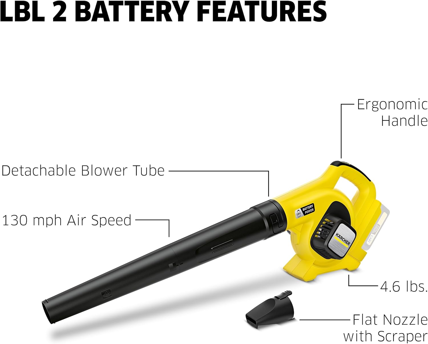 The Kärcher LBL 2 Cordless Leaf Blower is designed for efficient removal of leaves and loose dirt from various outdoor surfaces. This manual provides essential information for safe and effective operation, maintenance, and troubleshooting. Key features include a powerful 130 mph air speed, a lightweight design at 4.6 lbs, an ergonomic handle for comfortable use, and a detachable flat nozzle with a built-in scraper for versatile cleaning tasks.