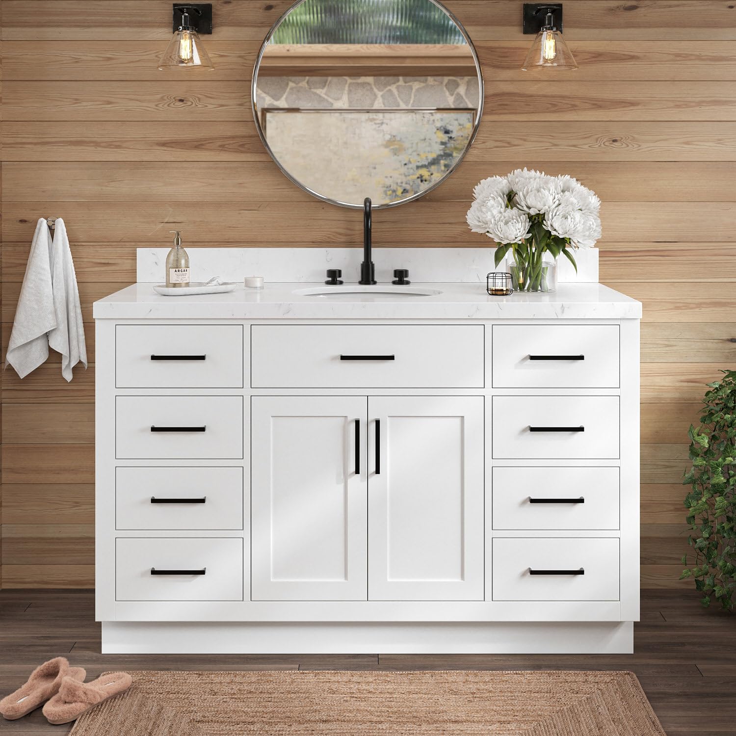 The ARIEL Hepburn 54-inch Bathroom Vanity is crafted from solid hardwood with plywood panels, ensuring durability and resistance to moisture and temperature changes. It features a 1.5-inch edge Carrara Quartz countertop, a single oval under-mount sink, and soft-closing doors and drawers for quiet operation. The design includes nine full-extension dovetail drawers, with one 45-degree open tilt drawer, and a toe kick for convenience.