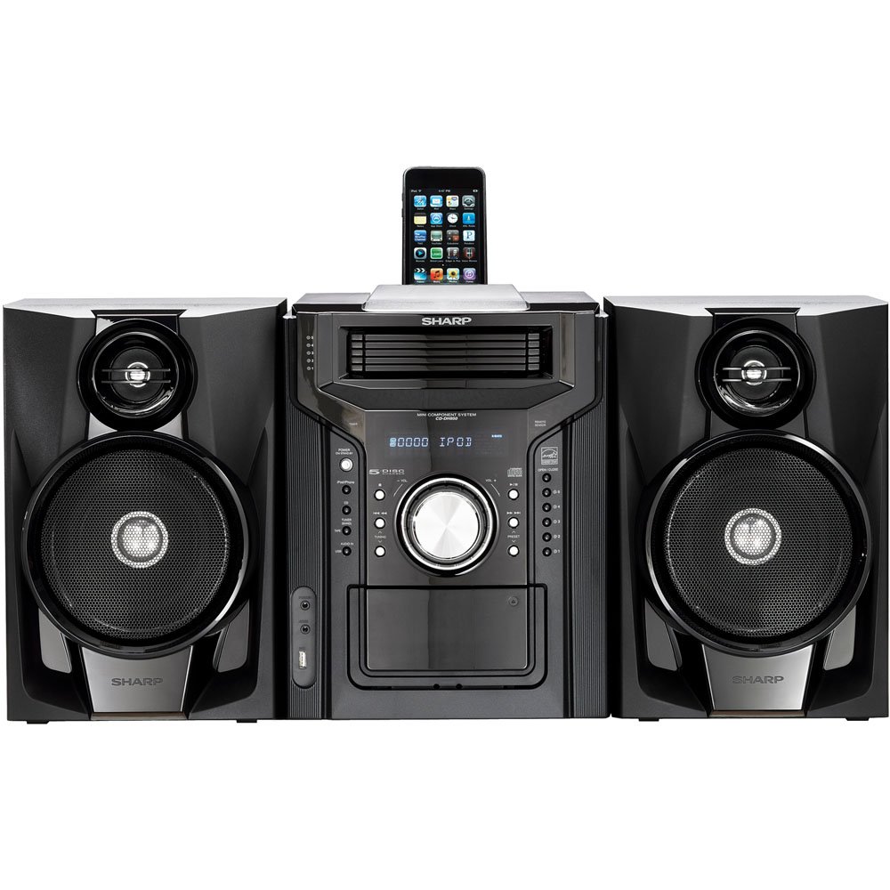 شڪل 4.3.1: مجموعي طور view of the Sharp CD-DH950P Mini-Component System, showing the main unit flanked by two speakers, with an iPhone docked on top of the main unit.