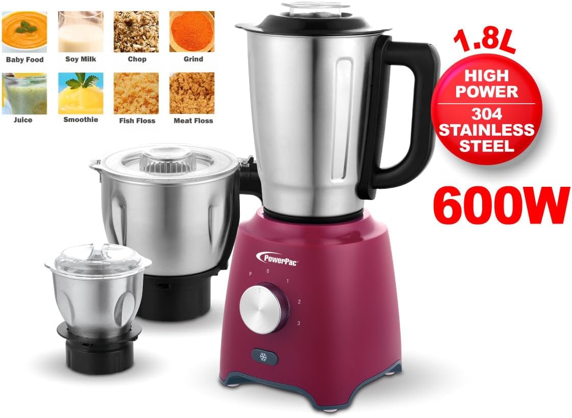 Image: The PowerPac PPBL906 3-in-1 Food Blender showing the main blender jug, the grinder attachment, and the chopper attachment, all connected to the motor base. The image highlights the 1.8L capacity, 600W power, and stainless steel construction.