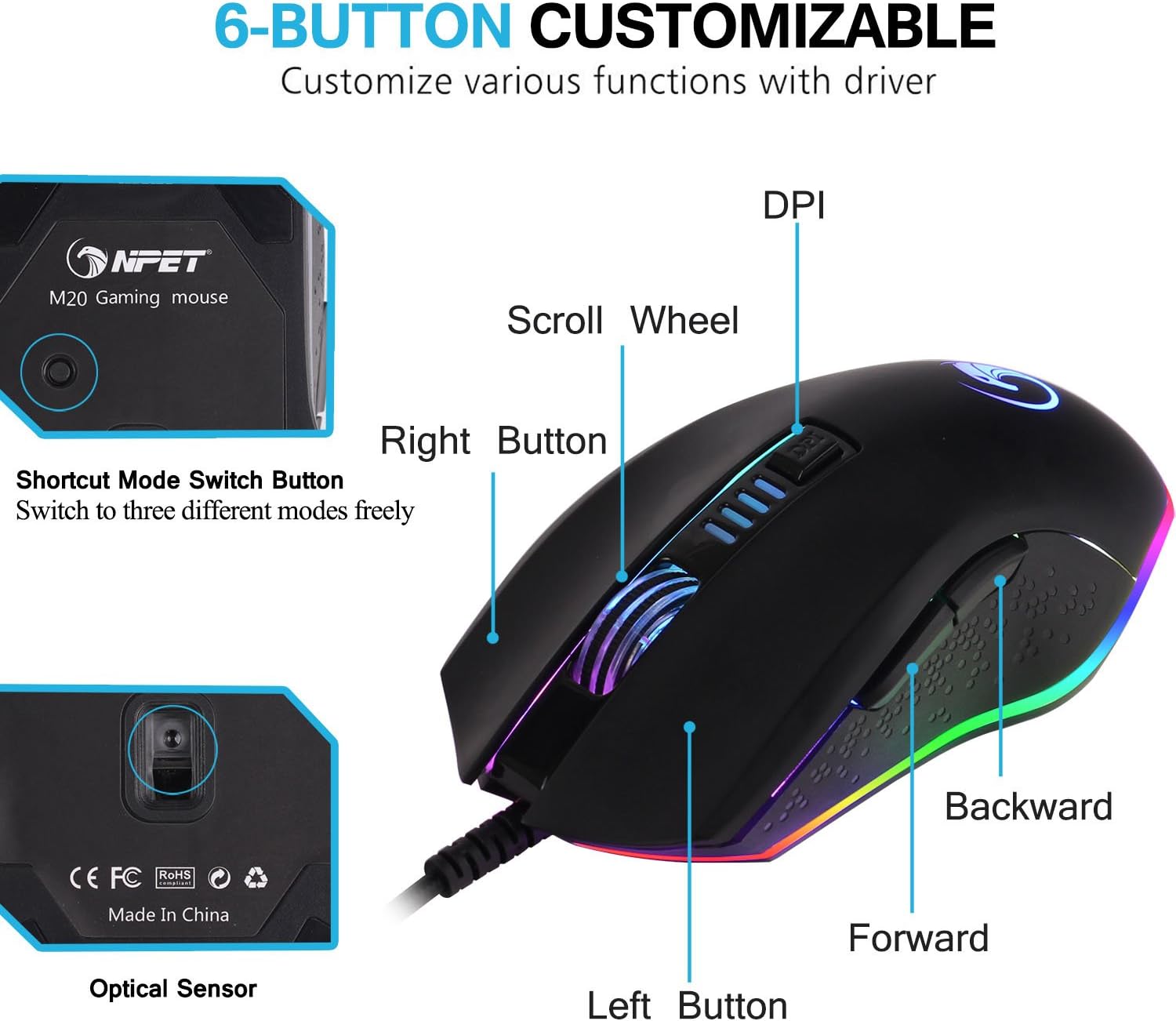 The NPET M20 Gaming Mouse features 6 buttons for various functions: