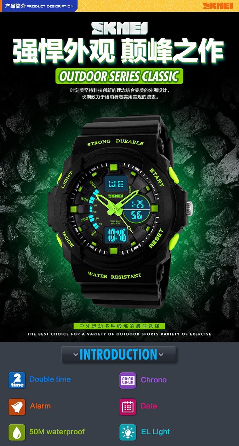 The SKMEI 1061 watch combines a classic analog pointer display with a modern LED digital display, offering multiple functions including time, date, day of week, alarm, chronograph (stopwatch), and dual time. It is designed with 50-meter water resistance and an EL backlight for visibility in low-light conditions.